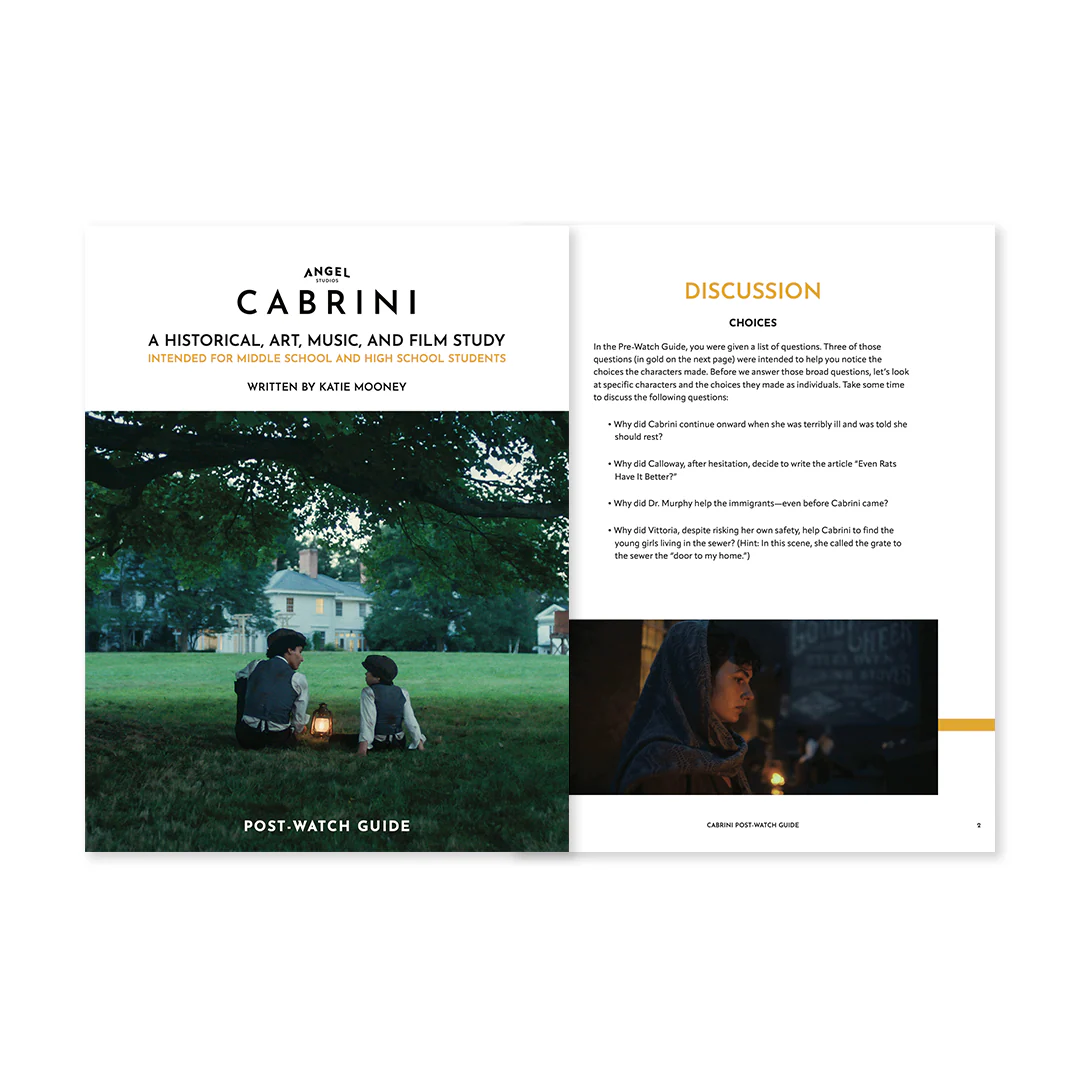In the Angel Studios' Pre-Watch Guide and Post-Watch Guide, students will learn the history of Italy and New York during the turn of the 20th century, the characters, and content of the film, basic elements of film, three social reformation movements of the time (Child Labor, Women's Suffrage and Immigrant Living Conditions), and the music of the time. There are introspective questions to guide students to see themselves in the characters and think about how Cabrini and the film influenced them. They will learn through question-lead discussions, photograph study, reading, writing a historical essay, writing their own film review, optional journal writing, optional soundtrack listening and optional research topics.