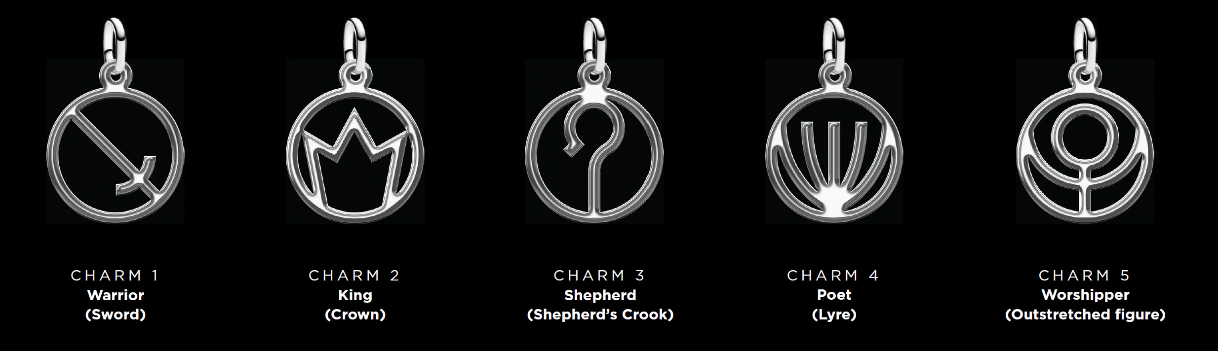 Discover a charm necklace that channels every facet of your spirit! The DAVID charm necklace features five sacred symbols, each embodying a different aspect of David's divine journey: a sword to honor his warrior strength, a crown to celebrate his royalty, a shepherd’s crook to signify his nurturing spirit, a lyre to reflect his poetic soul, and outstretched arms to represent his devoted worship. Every time you wear this necklace, you’ll feel confident to step into your truest self!